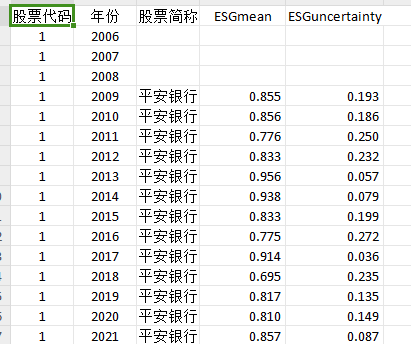 主要包括:股票代码、年份、股票简称、ESGmean、ESGuncertainty
