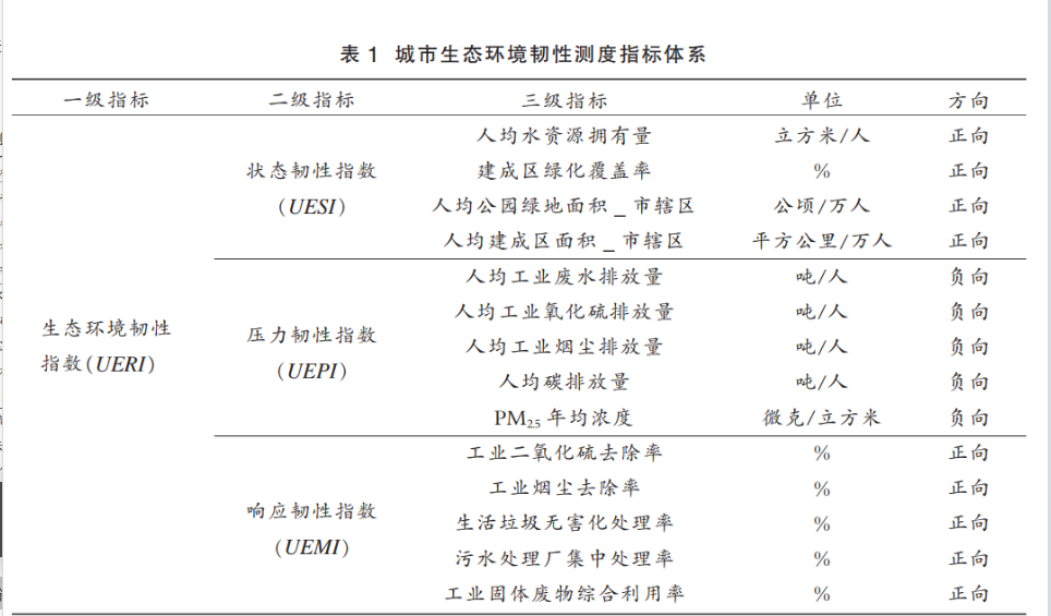 城市生态环境韧性指数,主要衡量一个城市在面临生态环境系统压力或突发冲击时,约束污染排放、维护生态环境状态和治理能力提升的综合水平。参考郭海红和刘新民的研究,同时借鉴张吉鹏和彭靖秋环境质量绩效评估方法,并考虑到城市的经济社会特征,将城市生态环境韧性指数分解为状态韧性指数、压力韧性指数、响应韧性指数 3 个子维度,共同支撑整体链式的城市生态韧性指标体系,3 个二级指标由 14 个三级指标具体测度(见下图)。由于不同指标对总的韧性指数存在正反方向的影响,借鉴 Zhou 等和王军等的方法对各指标数值进行无量纲化处理,使用熵值法赋权综合测算各城市的生态环境韧性指数。