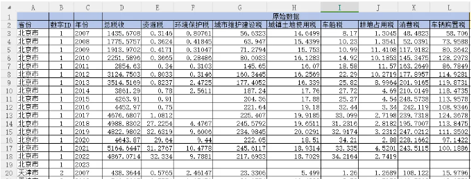相关数据及指标:省份、数字ID、年份、总税收、资源税、环境保护税、城市维护建设税、城镇土地使用税、车船税、耕地占用税、消费税、车辆购置税。