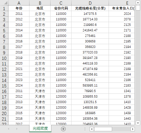 年份 地区 省份代码 光缆线路长度(公里) 年末常住人口(万人) 光缆密度
