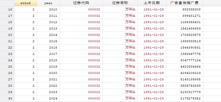 沪深京A股上市公司广告费用支出(2010-2024年) 广告宣传推广费用 .zip