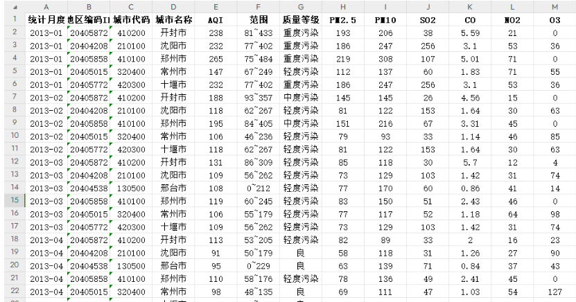 包含指标:统计月度、地区编码ID、城市代码、城市名称、AQI 、R范围、空气质量等级、PM2.5、PM10、SO2、CO、NO2、O3