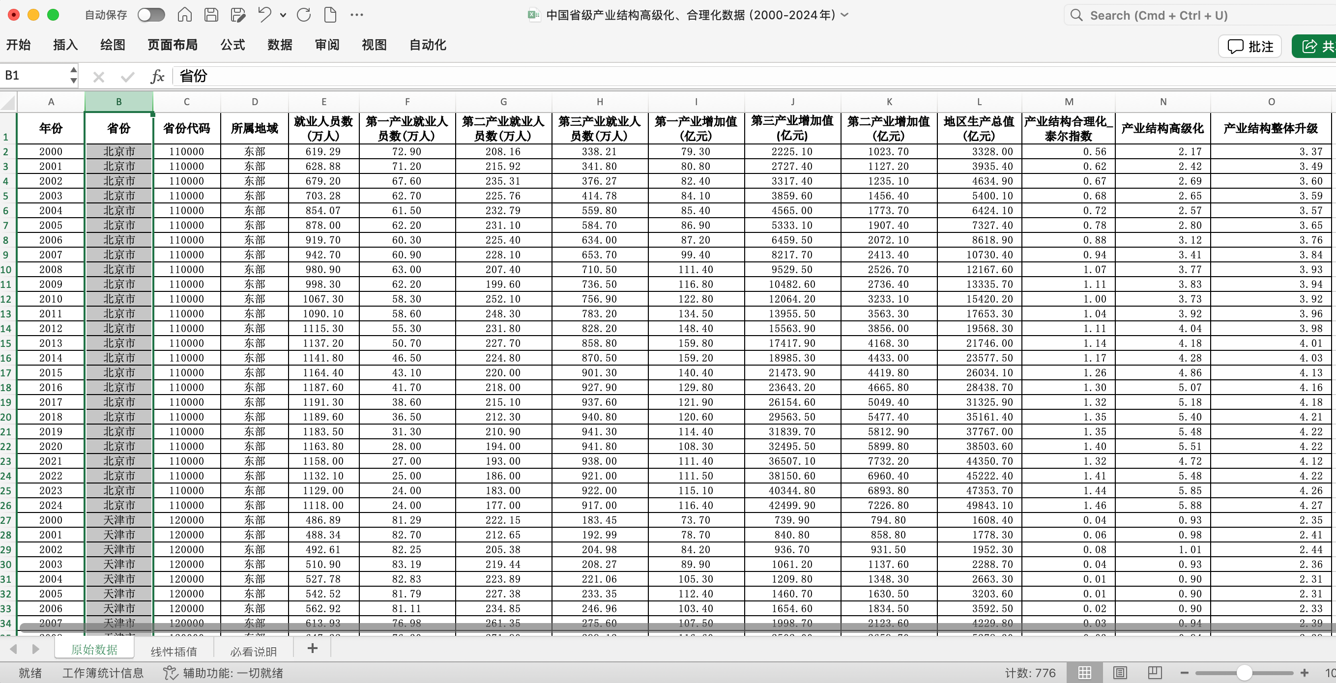 全国各省产业结构合理化、高级化与产业结构升级测算面板数据(2000–2024年,31省776样本)