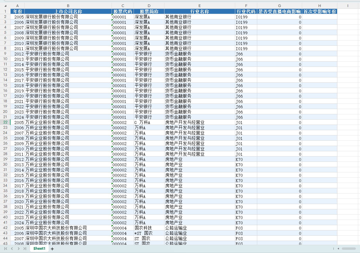 行业名称 | 行业代码 | 是否受直播电商影响 | 首次受影响年份 |