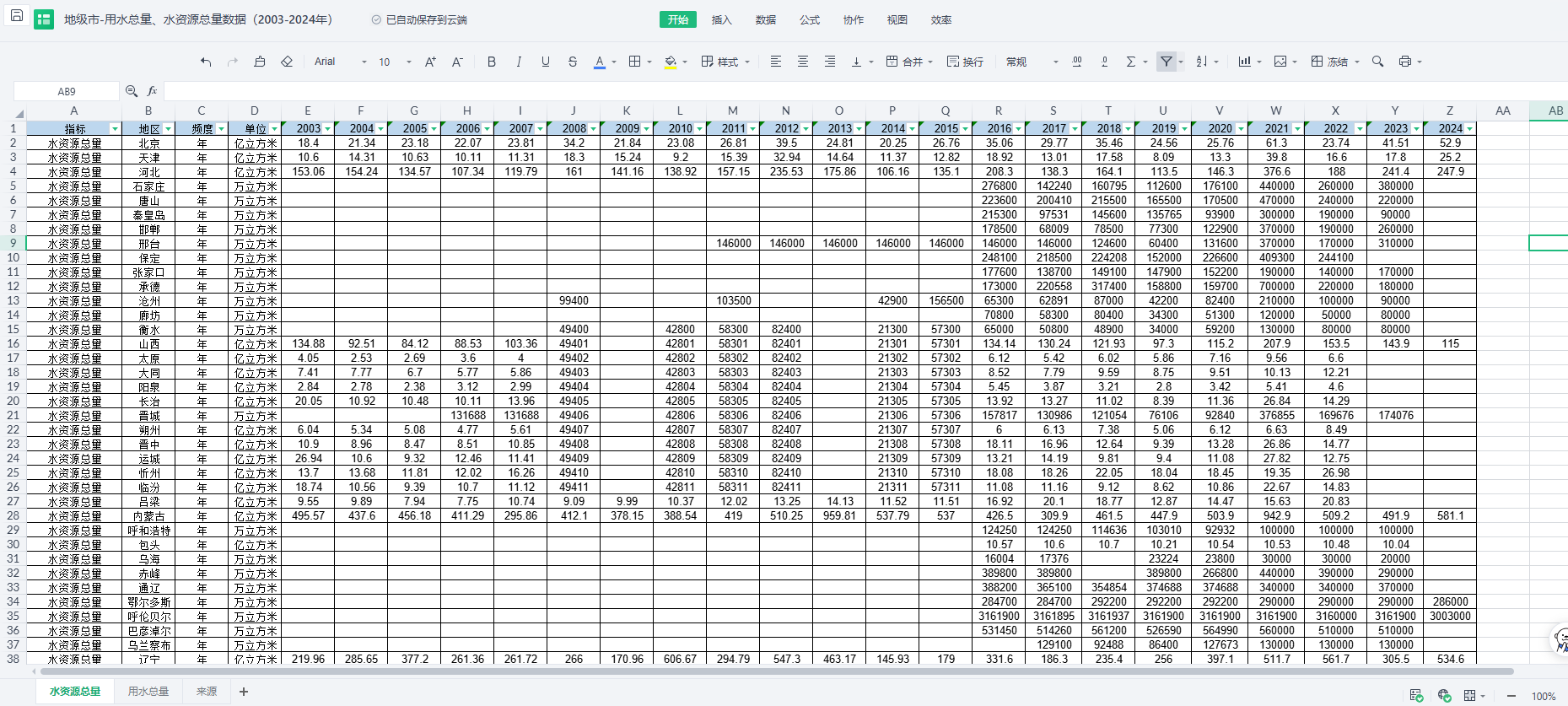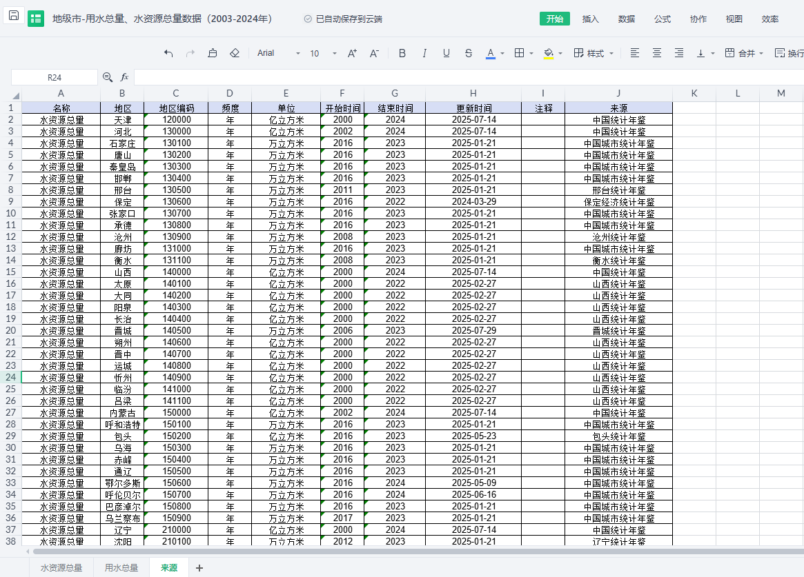 【面板数据】地级市-用水总量及水资源总量数据集(2003-2024年)