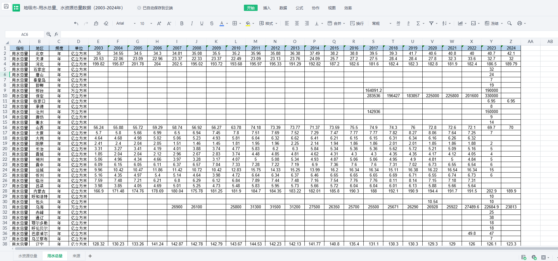 :地区、单位、年份、水总量、水资源总量