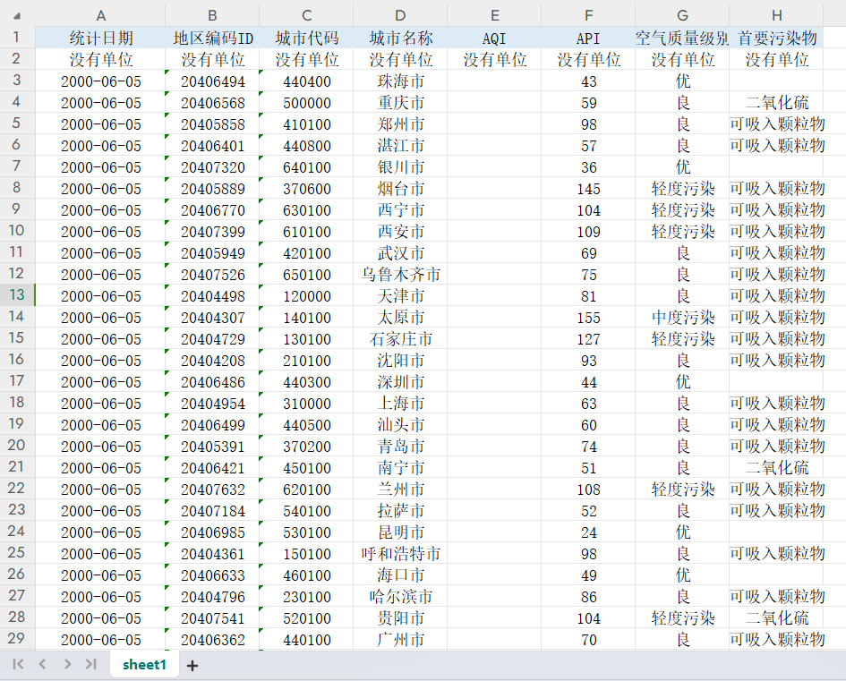主要指标:地区名称、AQI指数、空气质量级别、首要污染物
