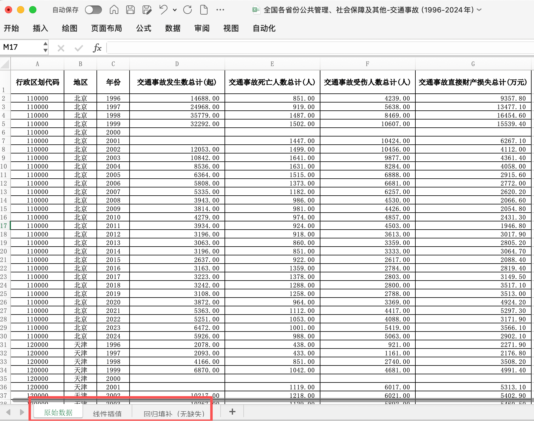 本数据为全国省级层面交通事故与火灾事故统计数据,形成跨年度面板结构。