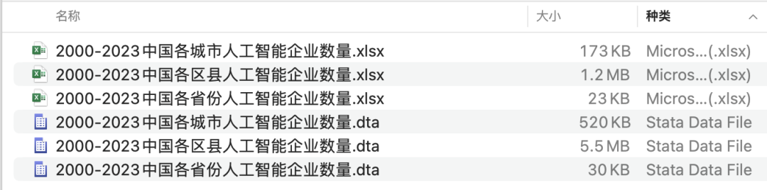 共计5个指标:所属年度、所属省份、所属城市、所属区县、人工智能企业数量
