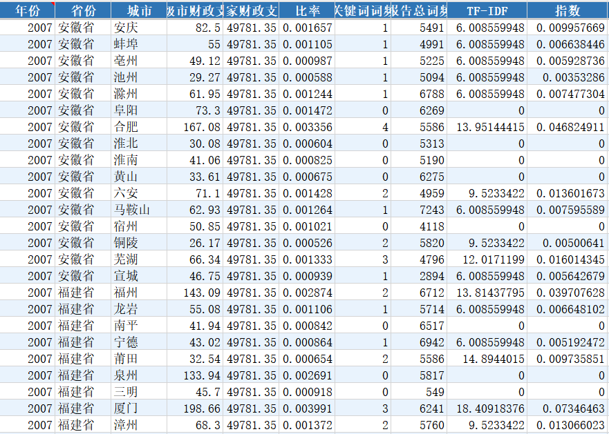 为对应关键词θ的逆文本频率(Inverse DocumentFrequency,IDF),CGt和cgt(θ)分别代表在第t年样本中的《政府工作报告》文本总量以及包含关键词θ的文本总量;最后参考杨海生等(2020),计算每年各地方政府财政支出与全国财政支出比率,进行加权调整,最终得到本文计量模型中使用的数字化政府建设指数。