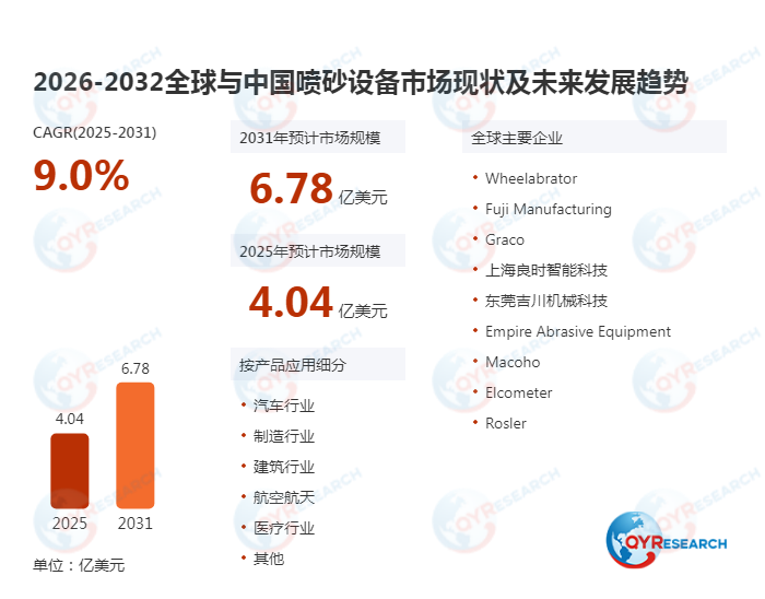 QYResearch调研显示,2025年全球喷砂设备市场规模大约为1.01亿美元,预计2032年将达到1.83亿美元,2026-2032期间年复合增长率(CAGR)为9.0%。