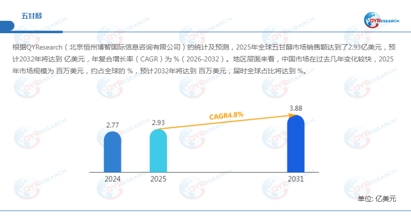 QYResearch调研显示,2025年全球五甘醇市场规模大约为2.93亿美元,预计2032年将达到4.05亿美元,2026-2032期间年复合增长率(CAGR)为4.8%。