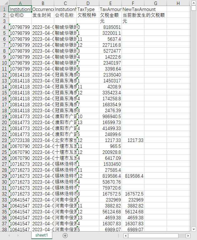 公司ID 发生时间 公司名称 欠税税种 欠税金额 当前新发生的欠税额