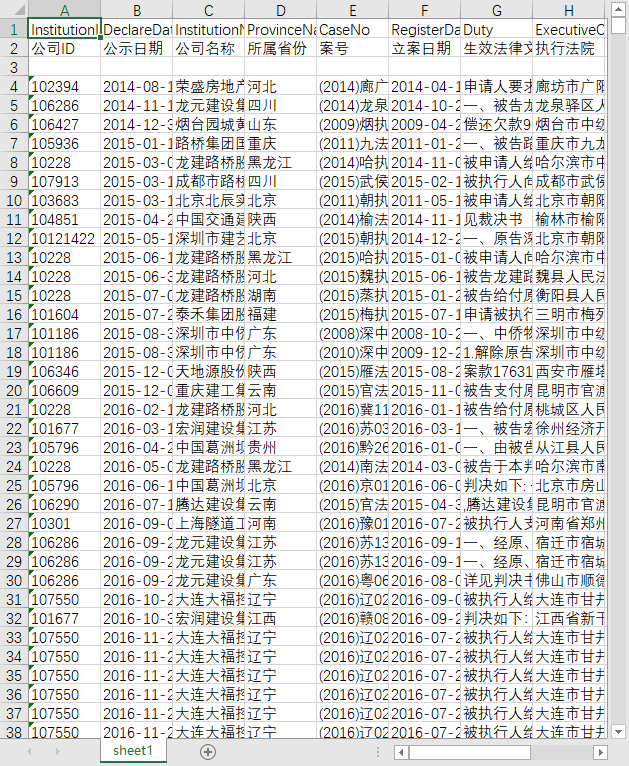 公司ID 公示日期 公司名称 所属省份 案号 立案日期 生效法律文书确定的义务 执行法院 做出执行依据单位 执行依据文号 履行情况 失信行为情形