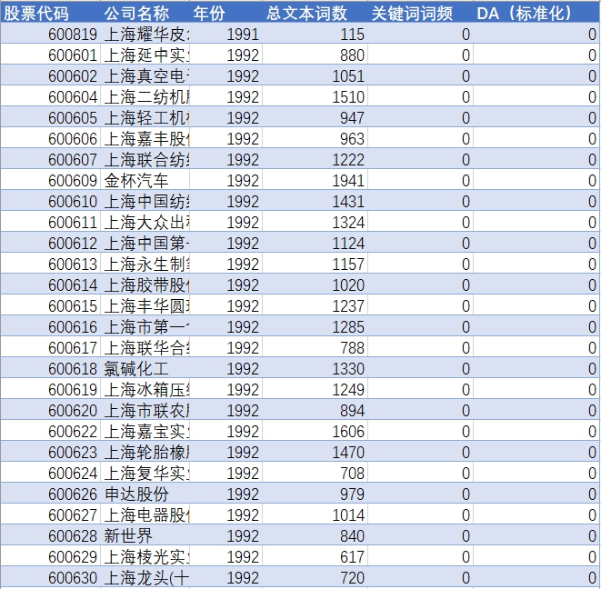 分别计算各公司年报中特征术语的绝对出现频次及其占总文本词汇量的相对比重,由于这类数据具有典型的 “右偏性” 特征, 对其进行对数化处理(即加 1 后取自然对数) , 从而得到刻画企业数据资产化程度的整体指标,包含股票代码、公司名称、总词数、特征词频次及占比的结构化数据集,为评估企业数字化转型水平、识别数据要素增值路径提供可度量依据,助力释放数据资产的经济价值与战略价值。
