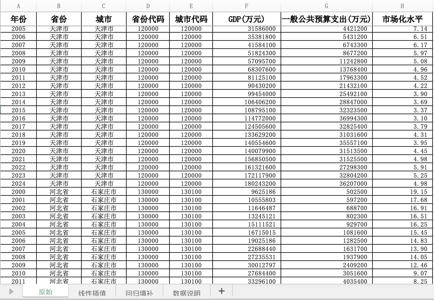全国298个地级市市场化水平测算数据-地区生产总值/地方政府预算支出(2000–2024年)