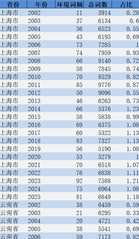首先,我们基于31 个省 2002—2025年政府工作报告的文本数据,对政府工作报告文本进行分词处理,参考哈工大停用词表,过滤掉年报文本中的停用词。随后基于论文中提到的部分与环境有关的词汇如下:“环境保护”、“环保”、“污染”、“能耗”、“减排”、“排污”、“生态”、“绿色”、“低碳”、“空气”、“化学需氧量”、“二氧化硫”、“二氧化碳”、“PM10” 以及“ PM2. 5”以所有政府工作报告为语料库进行word2vec拓展得到与环境有关的词汇词典共152个词。最后统计与环境相关词汇出现的频次,并计算其占政府报告全文词频总数的比例,从而得到刻画政府环境治理的整体指标,包含省份,年份,环境词频,总词频及占比的结构化数据集。