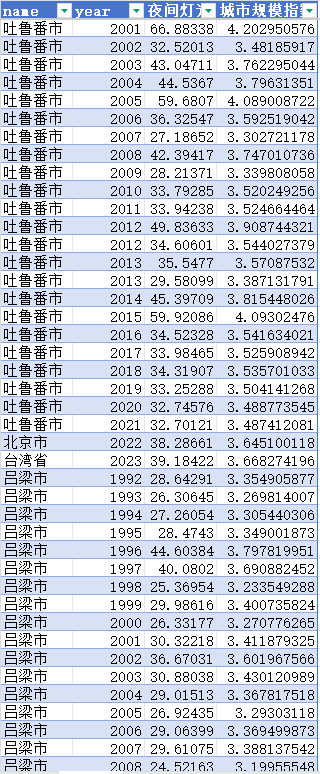 中国城市规模指数,参考丁从明等(2020)的做法,通过中国夜间灯光数据,提取其中各城市夜间灯光值大于等于22的区域取其平均值,再取其自然对数即为城市规模指数数据,整理成面板格式。