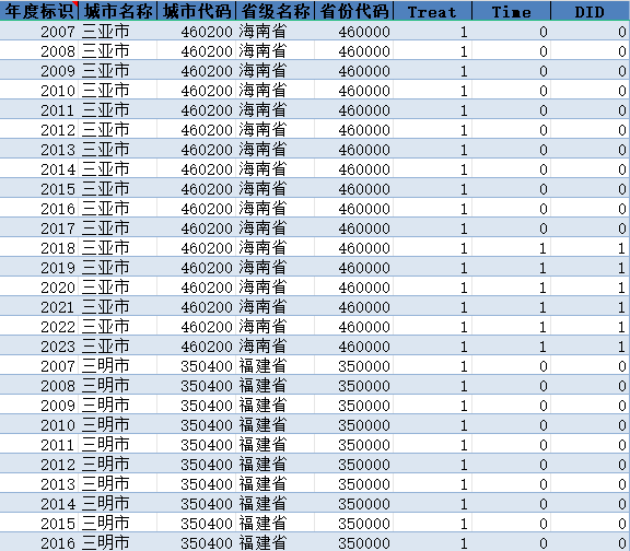 参考洪祥骏、林娴和陈丽芳(2023)的做法,使用“绿色信贷贴息政策试点”的政策虚拟变量(Treat×Post)表征。若样本城市为试点城市,则赋值为 1,否则为 0;Post为年份虚拟变量,在数据中为Time,需要注意的是,由于各个省市地方政府实施政策时间不同,因此在各自省市政策实施的年份及之后取1,否则为0,与此同时,未在2017年与2022年之间实施绿色信贷贴息政策的省市则在2017 年及之后取 1,否则为 0。