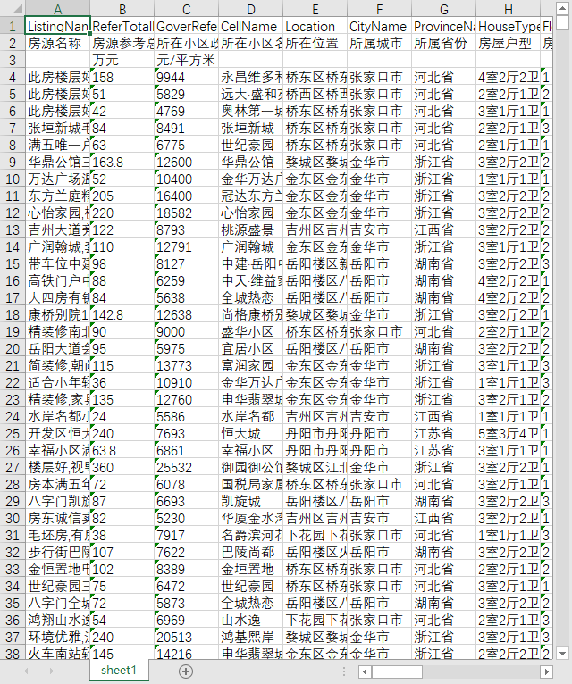 房源名称 房源参考总价 所在小区政府参考单价 所在小区名称 所在位置 所属城市 所属省份 房屋户型 房屋所在楼层 楼层总数 建筑面积 户型结构 套内面积 建筑类型 房屋朝向 建筑结构 装修情况 梯户比例 是否配备电梯 挂牌日期 交易属性 上次交易日期 房屋用途 房屋年限 产权所属 抵押信息