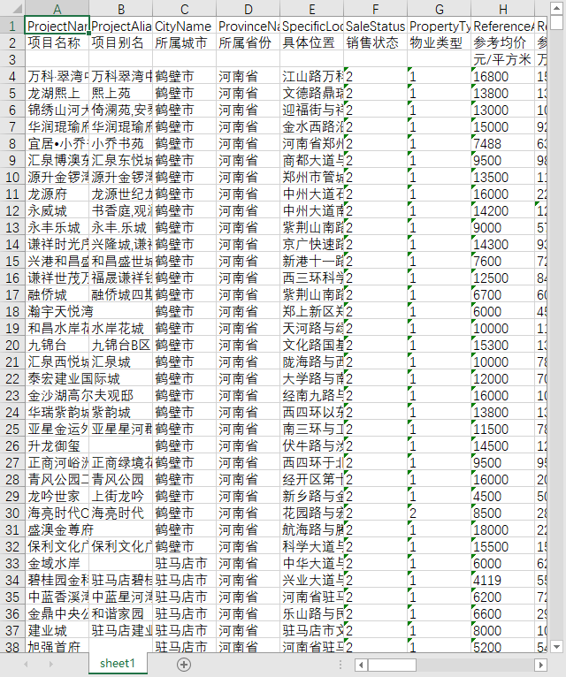 项目名称 项目别名 所属城市 所属省份 具体位置 销售状态 物业类型 参考均价 参考总价 开发商 开盘时间 建筑类型 占地面积 建筑面积 规划户数 产权年限 楼盘户型 绿化率 容积率 物业公司 物业费 车位配比 地上车位数 地下车位数 供水方式 供电方式 供暖方式