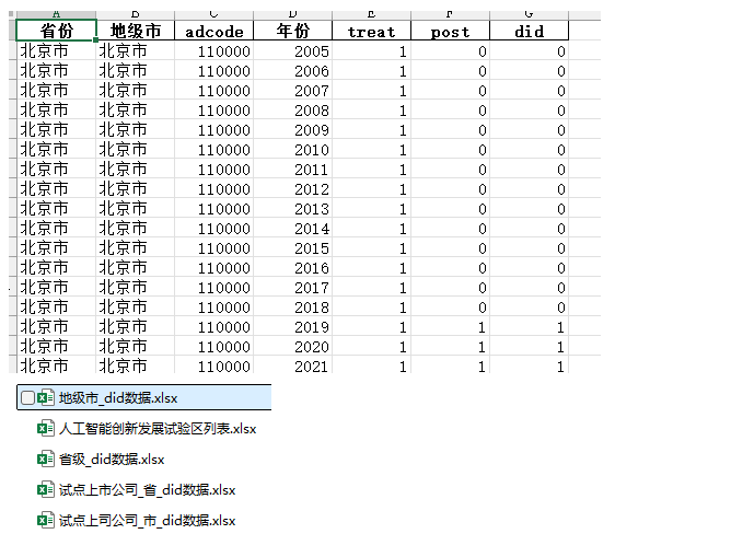 在数字经济与人工智能深度融合的背景下,人工智能创新发展试验区作为国家推动 AI 技术落地、产业升级的核心载体,其政策实施效果的精准评估对优化创新治理体系具有关键意义。本数据基于双重差分(DID)方法构建,可有效剥离政策干预与时间趋势的混淆效应,为检验试验区设立对区域 AI 创新产出、产业集聚度及经济增长质量的因果效应提供核心支撑,填补了现有研究中缺乏长时序、多维度政策评估数据的空白。
