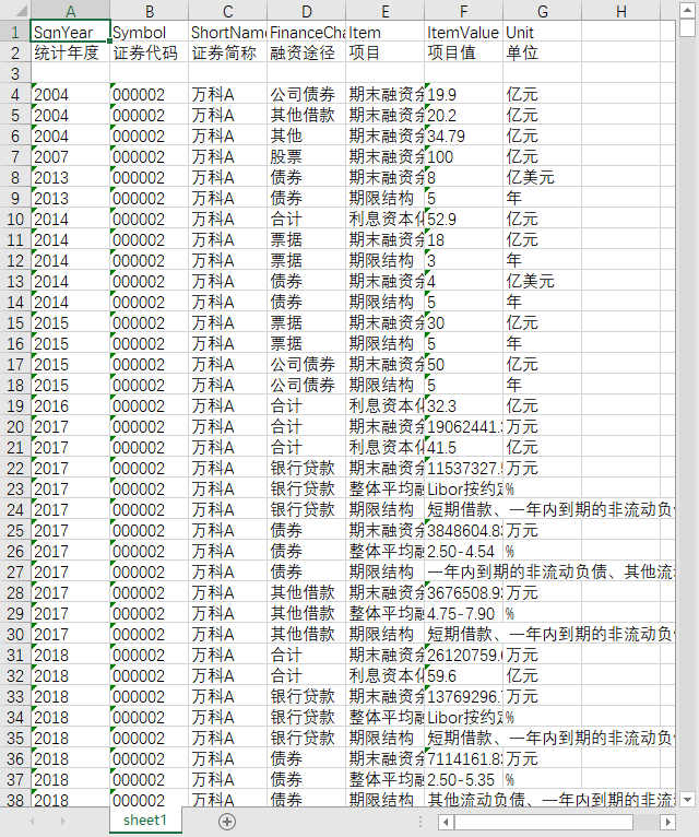 统计年度 证券代码 证券简称 融资途径 项目 项目值 单位