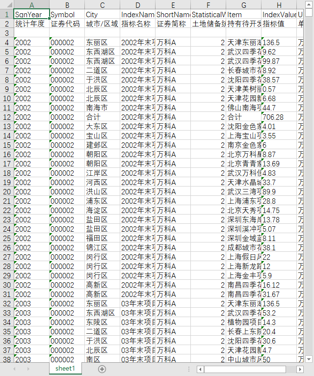 统计年度 证券代码 城市/区域 指标名称 证券简称 土地储备统计方式 持有待开发土地的区域/项目 指标值 单位