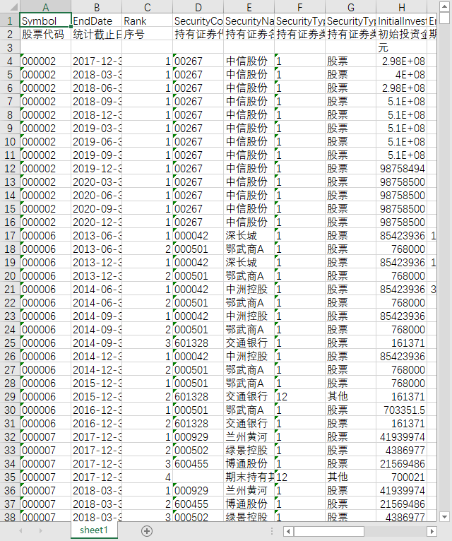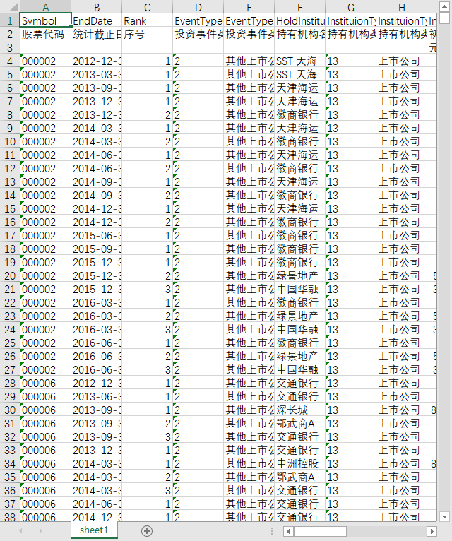 股票代码 统计截止日期 序号 投资事件类型编码 投资事件类型 持有机构名称 持有机构类别编码 持有机构类别 初始投资金额 期末持股数量 期末持股比例 期末账面余额 会计核算科目 投资收益 所有者权益变动额 股份来源编码 股份来源 货币编码 货币类型 说明