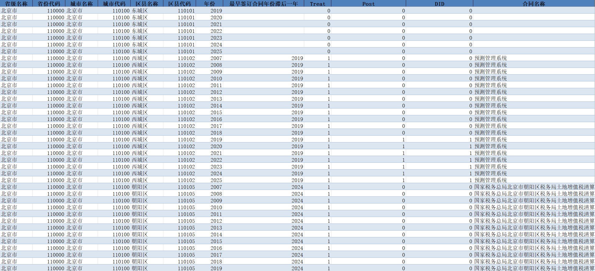 4.过滤出“税务数据分析能力”为1的合同样本观测值,再选择它们当中最早的采购年份,即每个区县最早的“合同签订年份”作为“最早采购年份”,并且滞后一年,作为DID起始年份,这是因为被参考方指出,需要考虑到当年与数据分析能力相关的政府采购要正式落地并发挥作用可能需要一定时间,所以滞后一年是合理的。
