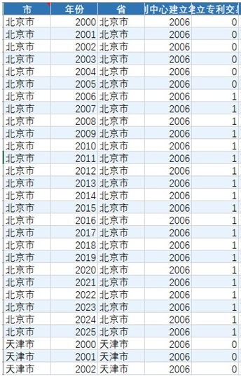 本团队参考Han等(2020)发布在《Management Science》上的文章,基于国家知识产权局公布的专利交易中心名单及建立时间,构建了一套完整的DID变量体系。该体系包含两个核心变量:,“专利中心建立年份”“是否专利交易中心建立之后的年份”。数据覆盖全国主要地级市,时间跨度为2000年至2025年,其中2006年起部分城市开始建立专利交易中心。本数据适用于开展动态DID、事件研究等实证分析,为理解专利交易中心建设的政策效果提供可靠的识别基础。