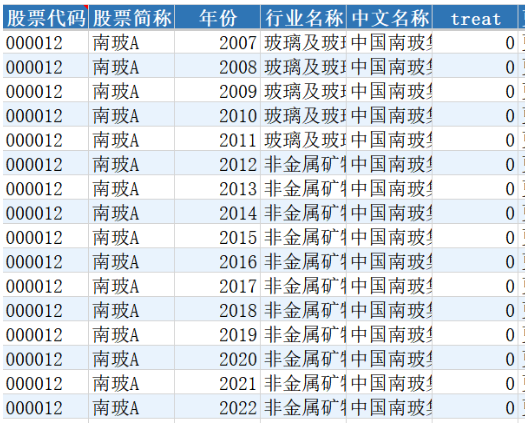 本数据集的核心变量“treat”构建方法参考周科选等(2024)的研究,定义为:若企业在某一年度被认定为制造业与互联网融合发展试点单位,则在该年度及之后年份中,treat取值为1,否则为0。该变量可用于构建DID模型中的政策交互项,进而识别政策冲击对企业全要素生产率、创新能力、融资约束等关键指标的影响。数据集系统整理了试点企业的股票代码、简称、全称、行业分类及统计截止日期等基本信息,具备结构化与标准化特征。