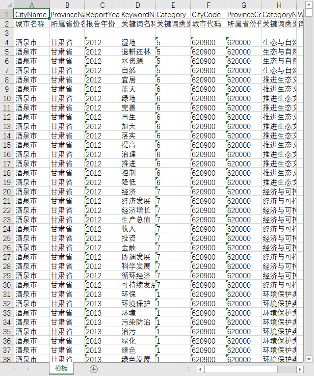 城市名称 所属省份名称 报告年份 关键词名称 关键词类别编码 城市代码 所属省份代码 关键词类别名称 词频 句频