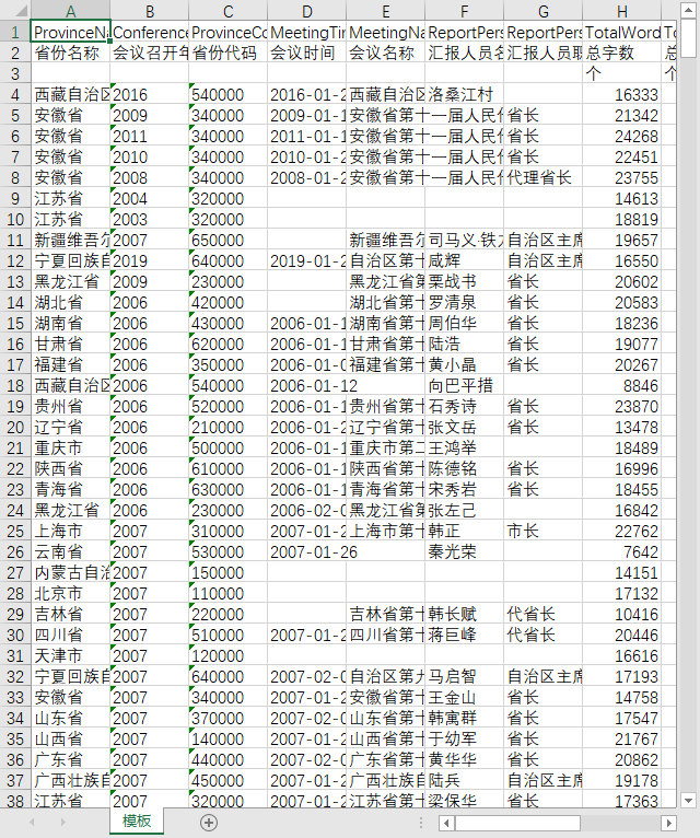 省份名称 会议召开年份 省份代码 会议时间 会议名称 汇报人员名称 汇报人员职位 总字数 总字数2 总词数 总词数2 总句数 报告内容