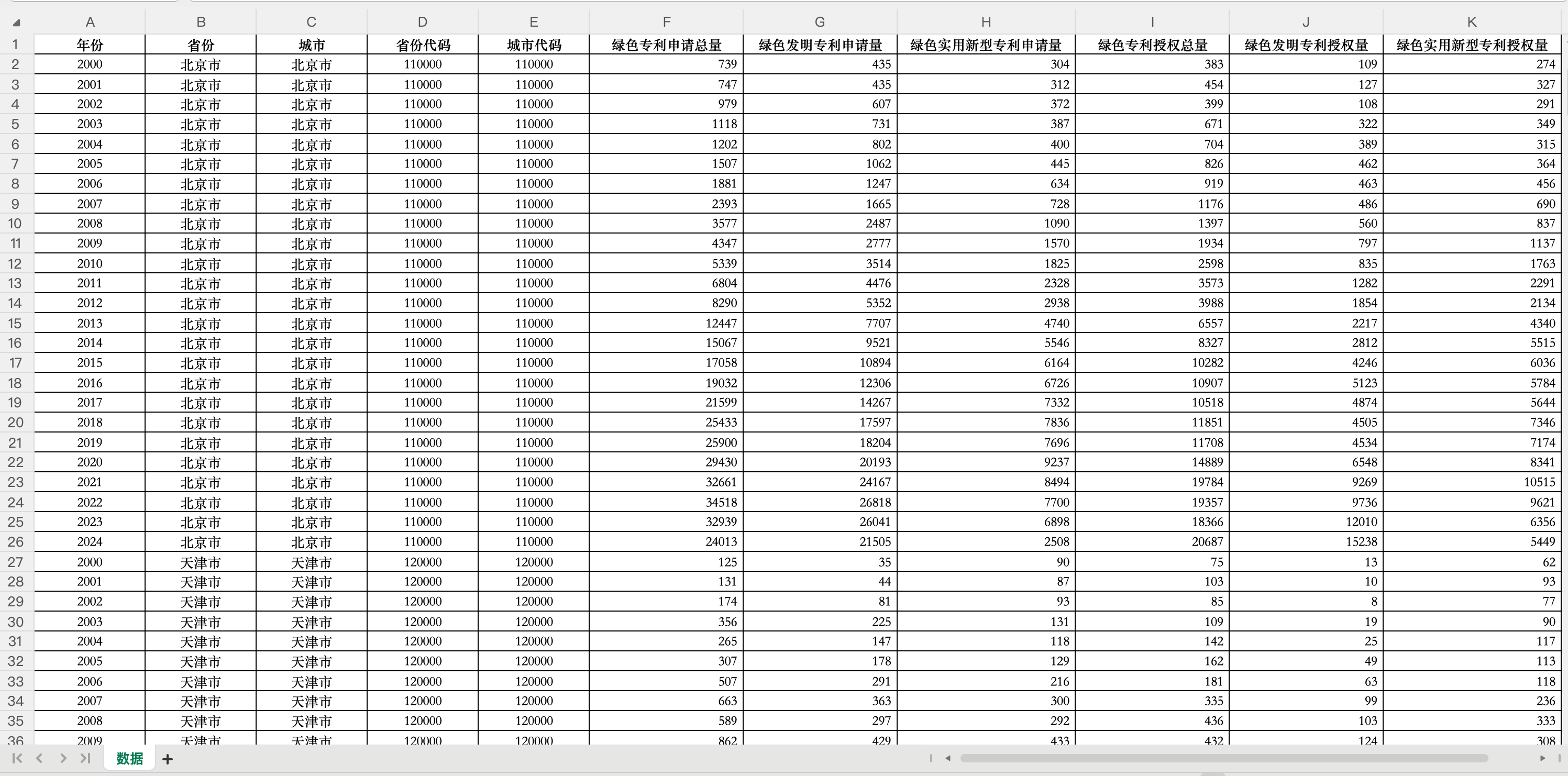 团队根据WIPO绿色专利清单,筛选了地级市的绿色专利2000-2024年数据。在学术研究中,绿色专利可用于衡量城市的绿色创新水平