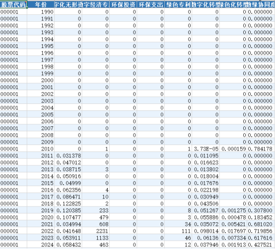 本数据为上市公司级面板数据,参考余菲菲等(2024)发布在《科研管理》上的文章制作,原始数据来源于官方权威渠道,具体包括:上市公司官网定期披露的年度财务报告(含“在建工程”“管理费用”“营业外支出”等与数字化投入、环保支出相关的科目明细)、上市公司在证券交易所官网发布的年度报告及社会责任报告、国家知识产权局官方平台公开的专利授权数据(含数字经济领域专利、绿色专利分类信息)。数据整理过程中,通过人工核验与逻辑校验相结合的方式,对原始数据进行筛选、清洗、匹配与标准化处理,剔除数据缺失严重、异常值突出的观测样本,最终形成1988-2025年共计95564条观测值的完整数据集。该数据集覆盖时间跨度长达38年,包含多家不同行业、不同区域上市公司的连续观测数据,能够充分反映我国上市公司数绿转型协同水平的动态演变特征,为长周期、多维度的实证研究提供了有力的数据保障。