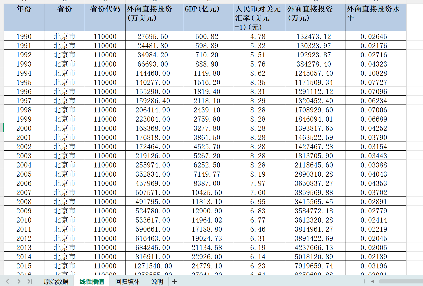 年份 省份 省份代码 外商直接投资(万美元) GDP(亿元) 人民币对美元汇率(美元=1)(元) 外商直接投资(万元) 外商直接投资水平