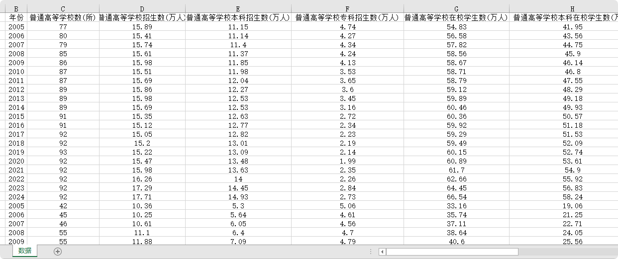 4、数据指标:普通高等学校数、普通高等学校招生数、普通高等学校本科招生数、普通高等学校专科招生数、普通高等学校在校学生数、普通高等学校本科在校学生数、普通高等学校专科在校学生数。