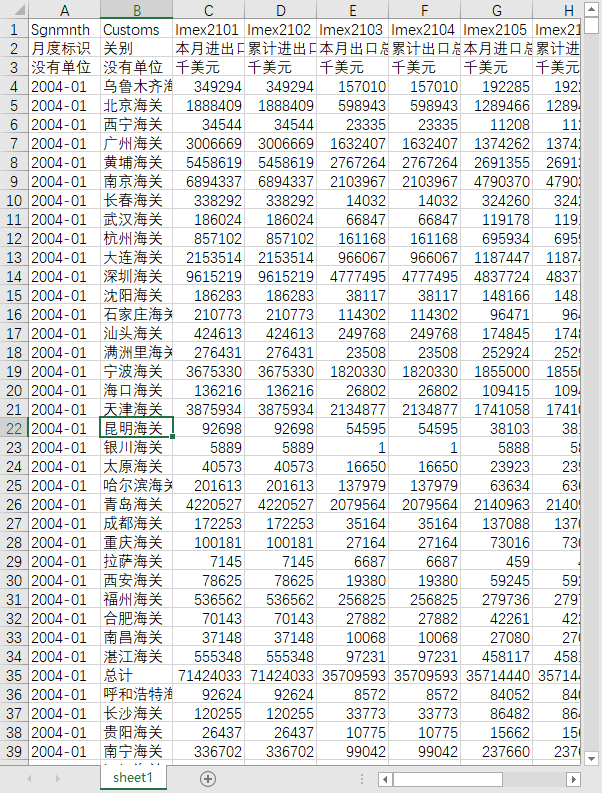中国进出口商品关别总额月度统计文件2004-202512按海关的进口出口贸易北京广州上海等40多个海关