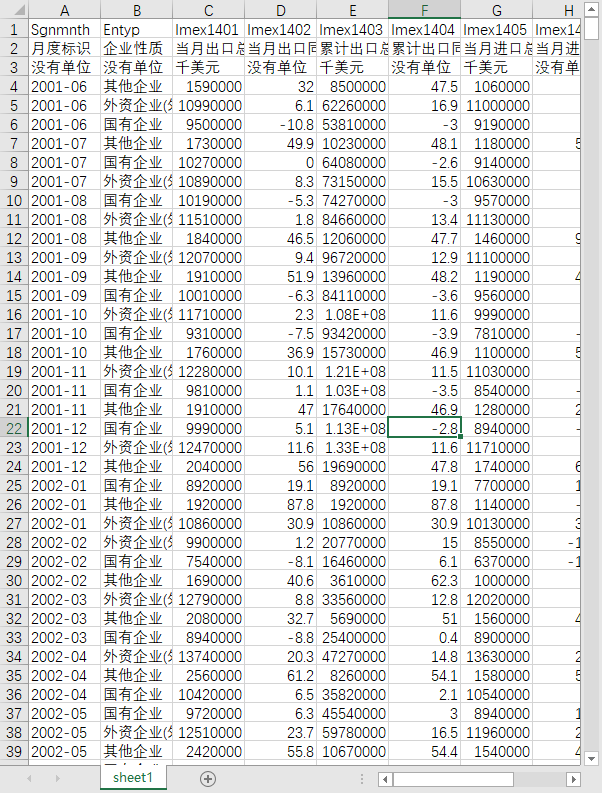 月度标识 企业性质 当月出口总额 当月出口同比增速(%) 累计出口总额 累计出口同比增速(%) 当月进口总额 当月进口同比增速(%) 累计进口总额 累计进口同比增速(%)