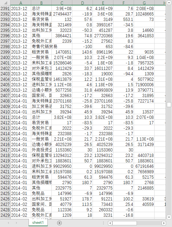月度标识 贸易方式 当月进出口 当月进出口同比增减(%) 累计进出口 累计进出口同比增减(%) 当月出口总额 当月出口同比增速(%) 累计出口总额 累计出口同比增速(%) 当月进口总额 当月进口同比增速(%) 累计进口总额 累计进口同比增速(%)