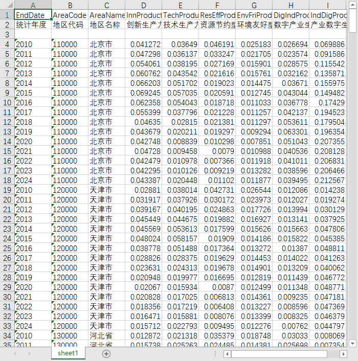 统计年度 地区代码 地区名称 经济产出 经济收入 就业结构 文化程度 培育经费 知识积累潜能 创新精神 创业精神 信息化水平 未来产业 绿色生态 绿色生产 基础设施 能源利用水平 能源利用潜力 科技创新水平 数字化水平