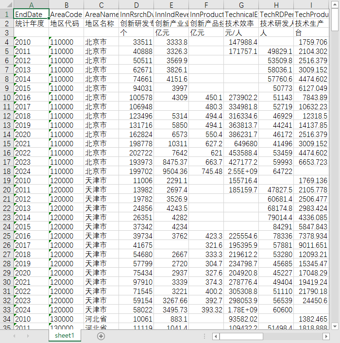 统计年度 地区代码 地区名称 创新研发专利数 创新产业业务收入 创新产品经费 技术效率 技术研发人数 技术生产 能源强度 能源结构 用水强度 废物利用率 废水排放 废气排放 电子信息制造 电信业务通讯 网络普及率 软件服务费用 数字信息 电子商务
