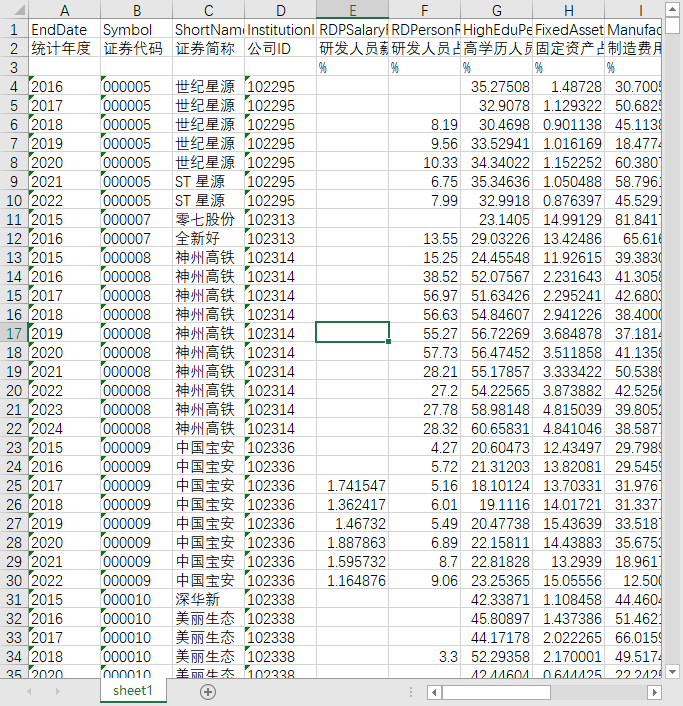 统计年度 证券代码 证券简称 公司ID 研发人员薪资占比 研发人员占比 高学历人员占比 固定资产占比 制造费用占比 研发折旧摊销占比 研发租赁费占比 研发直接投入占比 无形资产占比 总资产周转率 权益乘数倒数