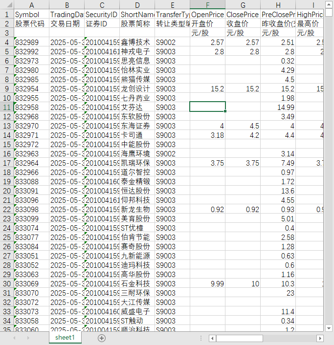 股票代码 交易日期 证券ID 股票简称 转让类型编码 开盘价 收盘价 昨收盘价(交易所) 最高价 最低价 成交量 成交金额 涨跌幅 涨跌 振幅 市场分层类别 市场分层编码