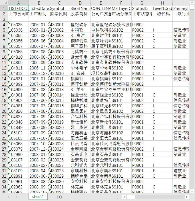 上市公司ID 上市时间 股票代码 股票简称 公司中文全称 市场分层编码 上市状态编码 一级代码 一级行业名称 二级代码 二级行业名称 三级代码 三级行业名称 四级代码 四级行业名称 上市公司经营性质编码 公司设立方式编码 公司成立日期 首次上市日期 退市时间 法人代表 总经理 董事会秘书 董秘联系电话 董秘联系传真 董秘电子信箱 证券事务代表人 注册资本 注册资本货币编码 注册地址 最近注册日期 公司办公地址 办公地邮政编码 面值 公司网址 电子邮箱 指定信息披露网站 年报备置地 所属城市代码 所属城市 所属省份代码 所属省份 国家区域3位英文代码 公司所属国家区域 主营业务 公司经营范围 公司历史沿革 股份公司设立日期 统一社会信用代码 上市市场编码 ISIN编码
