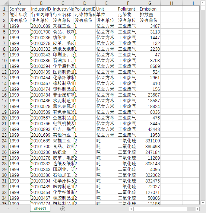 统计年度 行业内部编码 行业名称 污染物编码 单位 污染物 排放量