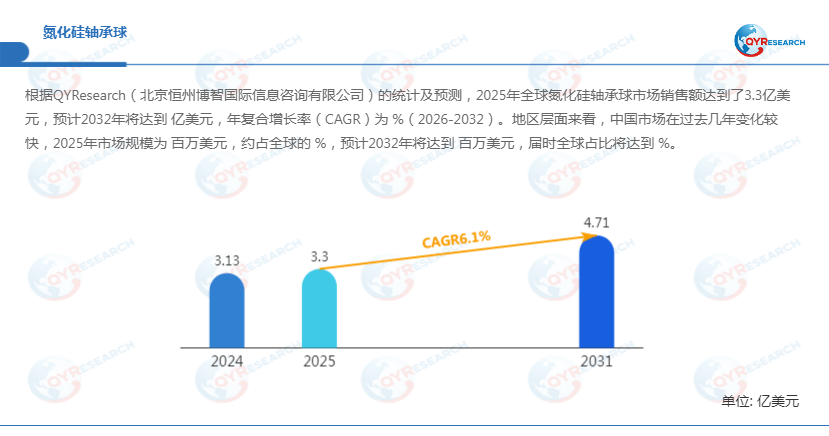 QYResearch报告出版商调研统计,2025年全球氮化硅轴承球市场销售额达到了22.43亿元,预计2032年将达到33.75亿元,年复合增长率(CAGR)为6.1%(2026-2032)。
