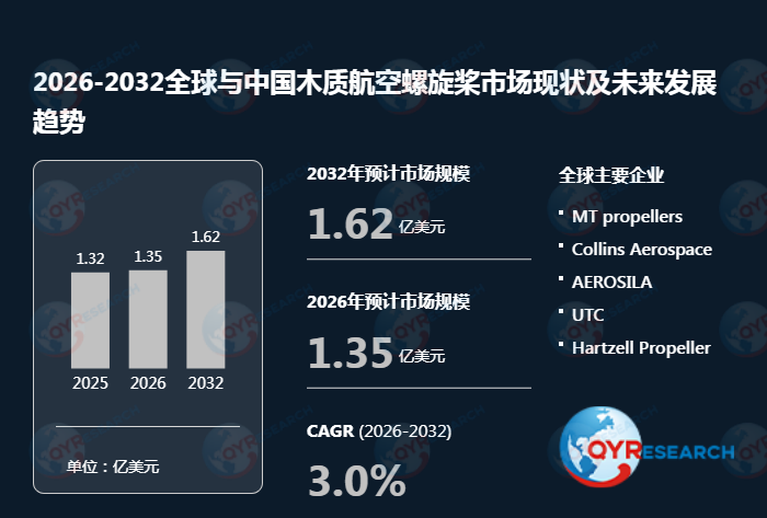 根据QYResearch(北京恒州博智国际信息咨询有限公司)的统计及预测,2025年全球木质航空螺旋桨市场销售额达到了1.32亿美元,预计2032年将达到1.62亿美元,年复合增长率(CAGR)为3.0%(2026-2032)。