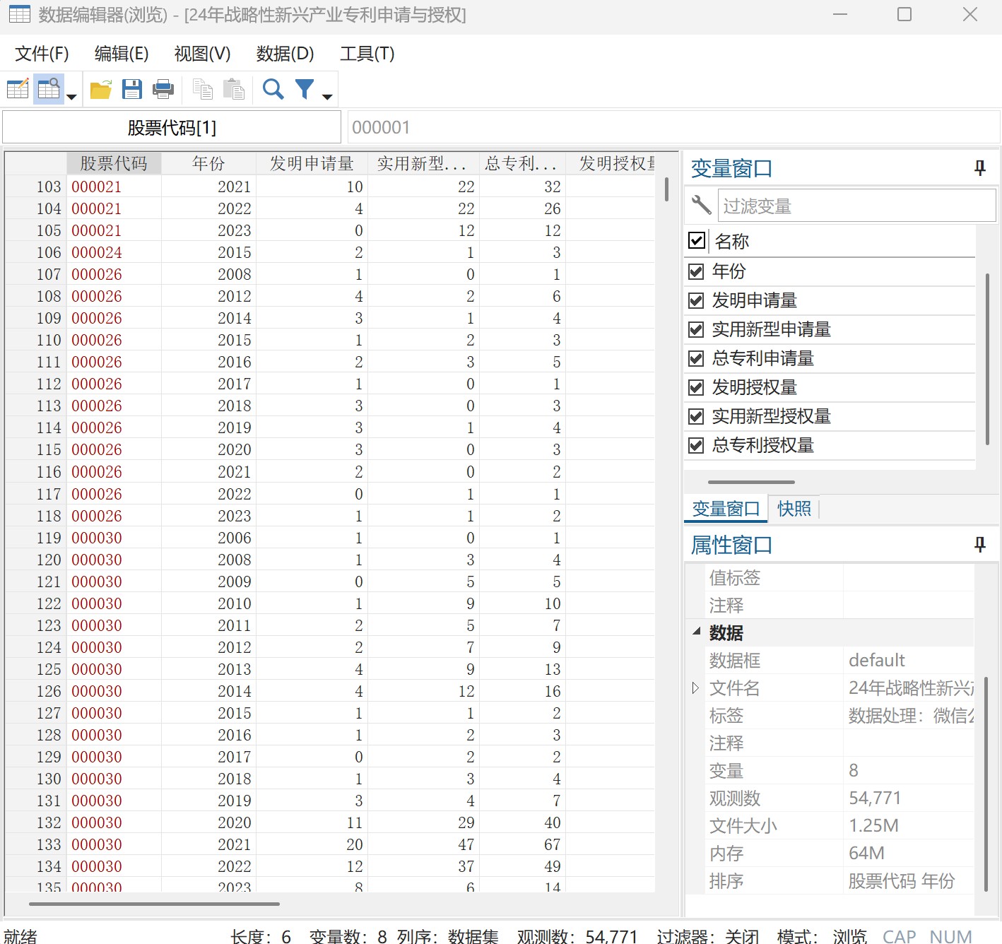 发展战略性新兴产业是推动我国产业结构转型升级,抢占新一轮经济制高点的重大战略决策,也是建立创新型国家和提高综合国力的必然选择。参考《战略性新兴产业分类与国际专利分类参照关系表(2021)(试行)》,将其中定义为战略性新兴产业专利的国际专利分类提取出来,与中国全量专利数据库进行匹配,筛选出战略性新兴产业专利数据再与上市公司进行匹配,保留了子母公司数据。数据包含年度面板统计表和匹配后的上市公司发展战略性新兴产业专利信息表。